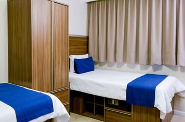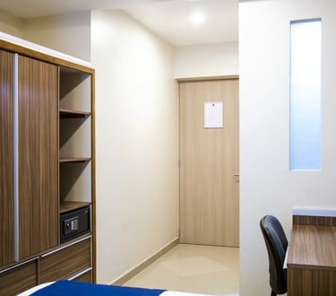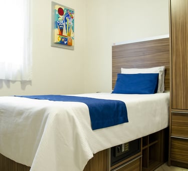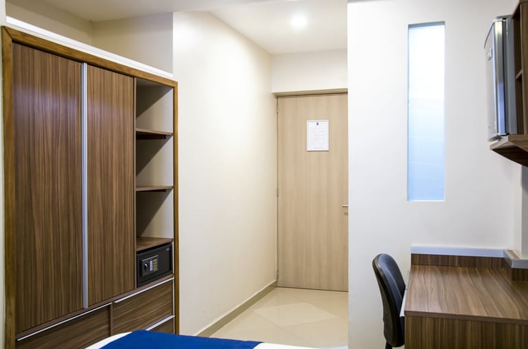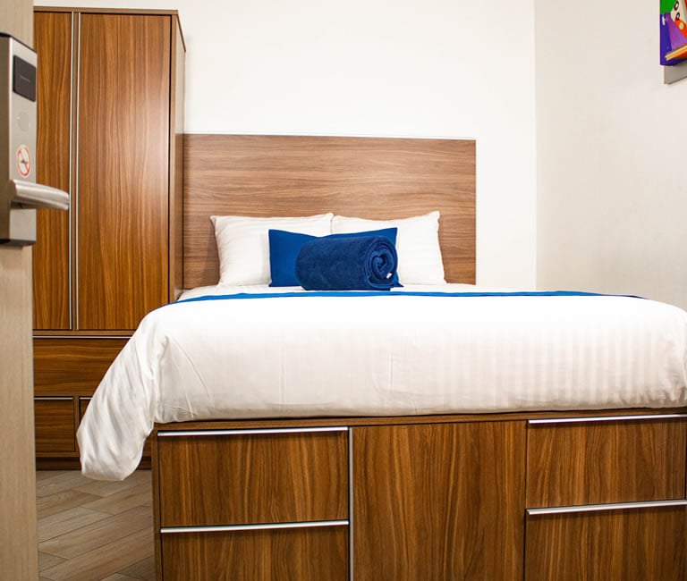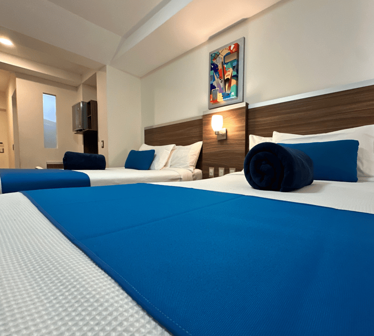 En La Casa Azul ofrecemos opciones pensadas para distintos tipos de estancia. Cada espacio cuenta con baño privado con agua caliente las 24 horas, wifi de alta velocidad, televisión, caja de seguridad, escritorio y acceso controlado.
