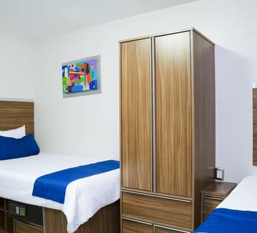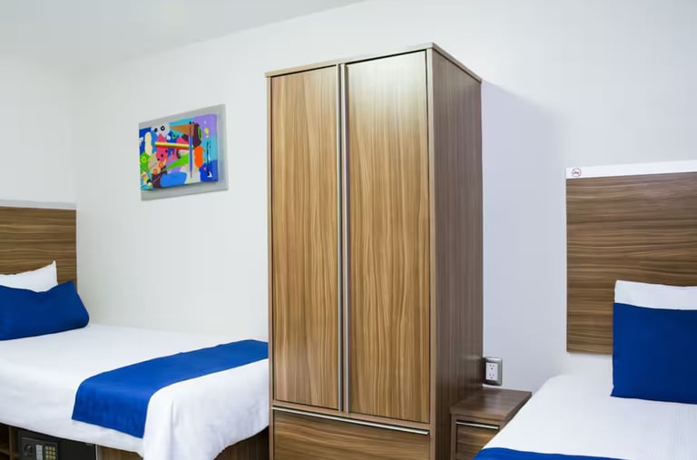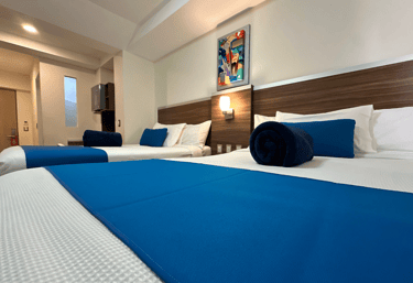 Perfecta para familias, con dos camas grandes, baño privado y acceso controlado para mayor seguridad.